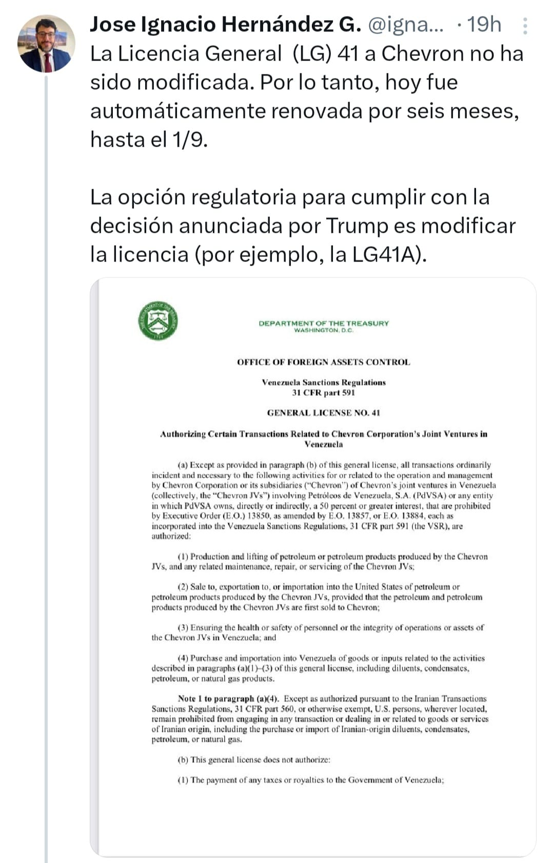 El abogado José Ignacio Hernández informó sobre la situación a través de su cuenta en X. “La Licencia General (LG) 41 a Chevron no ha sido modificada. Por lo tanto, hoy fue automáticamente renovada por seis meses, hasta el 1/9. La opción regulatoria para cumplir con la decisión anunciada por Trump es modificar la licencia (por ejemplo, la LG41A)”, detalló.